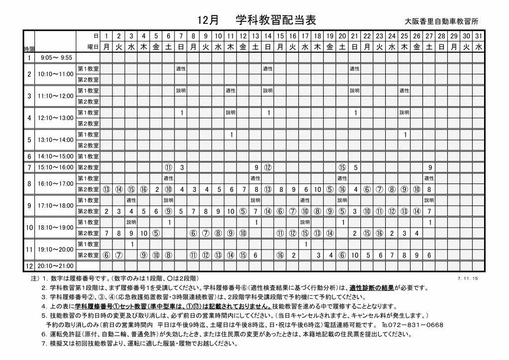 2 | 学科教習は、まず履修番号1を受講してください。 学科履修番号 ⑥(適性検査結果に基づく行動分析)は、適性診断の結果が必要です。 学科履修番号 ⑮(経路の設計)は、路上エリアマップを持参して受講してください。(二輪教習生の方は除く。) |
