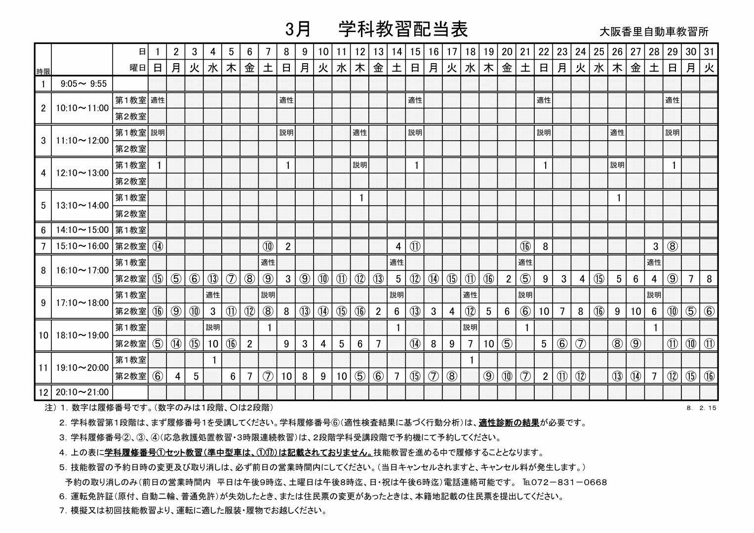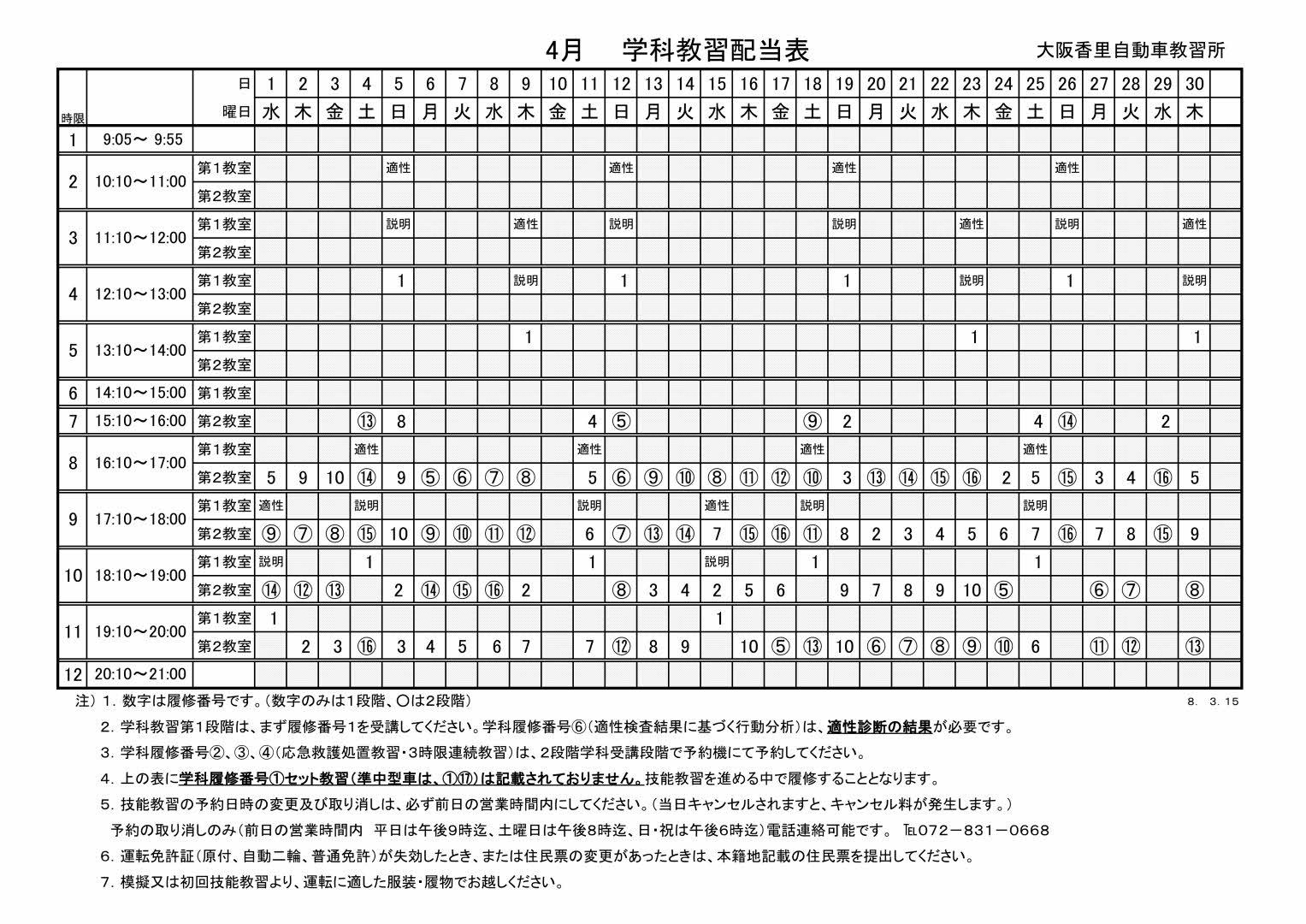 5 | 技能教習の予約日時の変更及び取消は、必ず前日の営業時間内にしてください。 (当日キャンセルは、技能教習1時限分のキャンセル料が必要となります。) 技能教習の予約の取消は、電話でも受け付けます。(前日の営業時間内) Tel072-831-0668 |